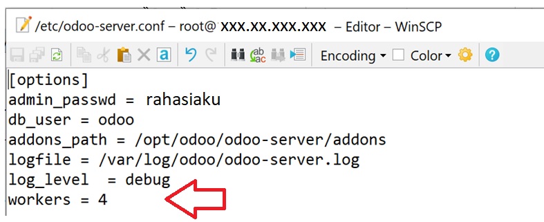 1. Edit file configurasi, yang terdapata pada ./etc/odoo-server.conf lalu tambahkah perintah workers = 4 seperti di bawah ini: