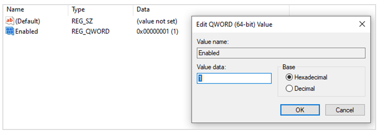 7. Pada opsi Enabled, masukkan value 1 di Value Data